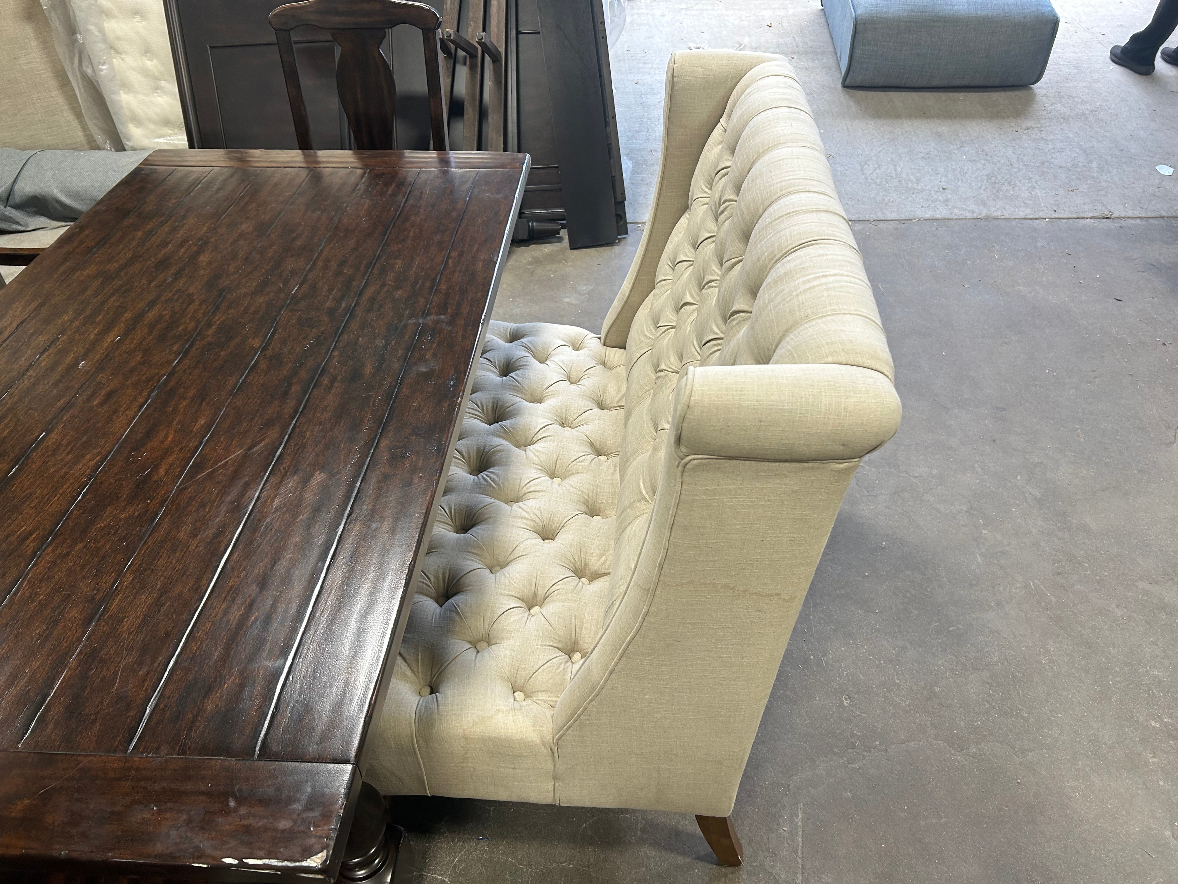 Looking for a stylish and sturdy dining set for your home? Look no further than this Pottery Barn 6-piece Benchwright dining set in a beautiful dark brown color. Made of hard wood, this set includes a bench and four chairs, perfect for hosting family gatherings or dinner parties. The set measures 74”x40”x30”, providing ample space for all your dining needs.