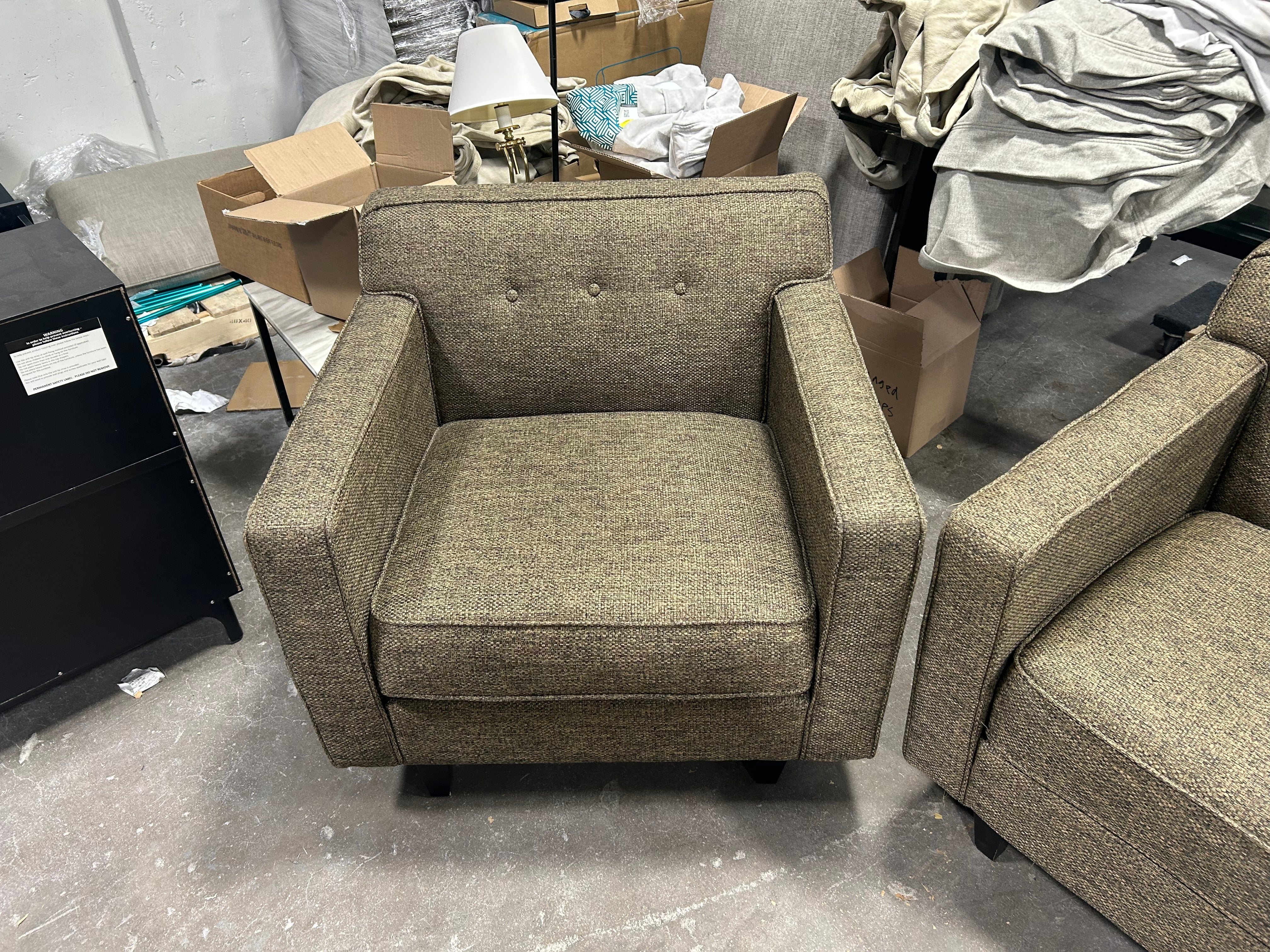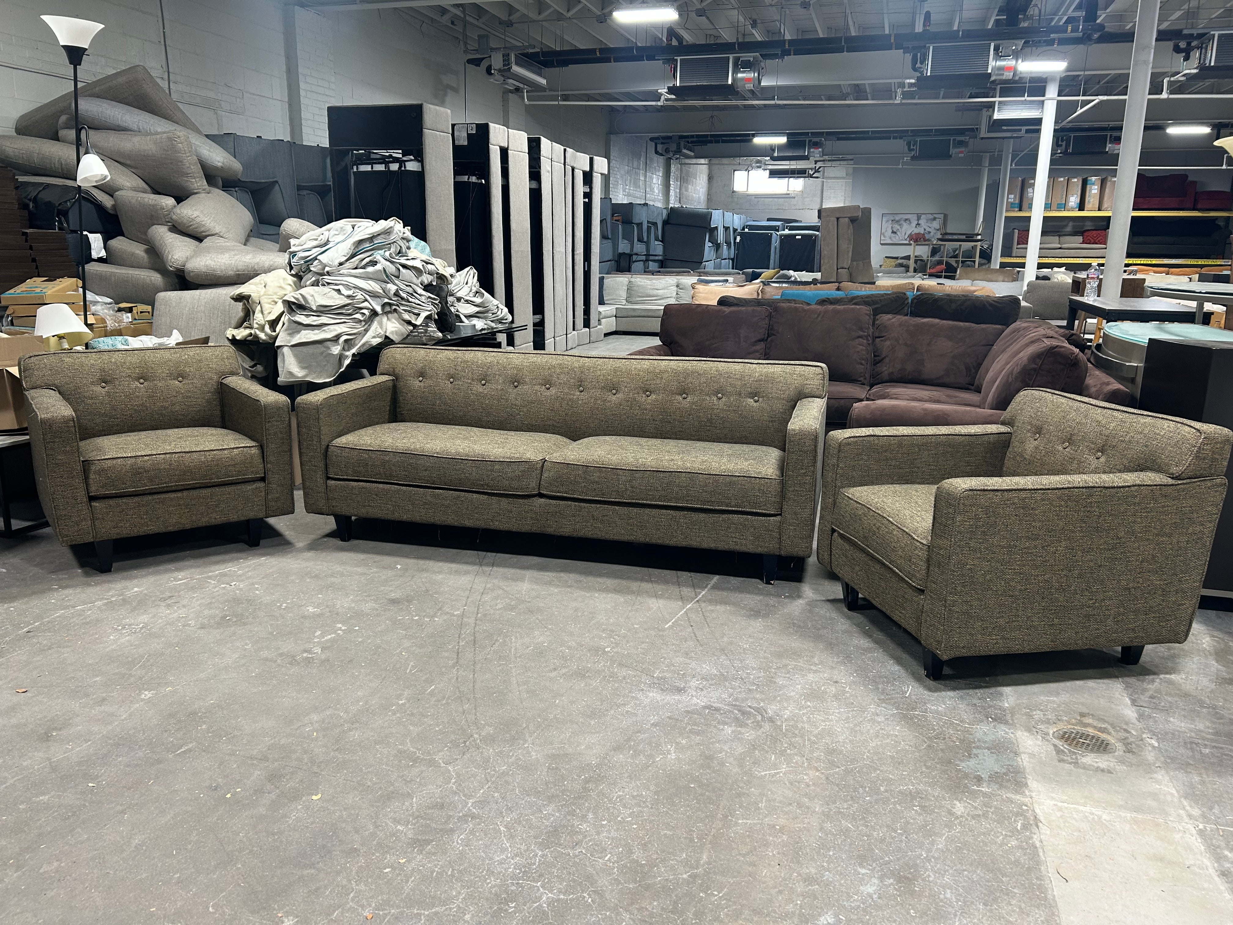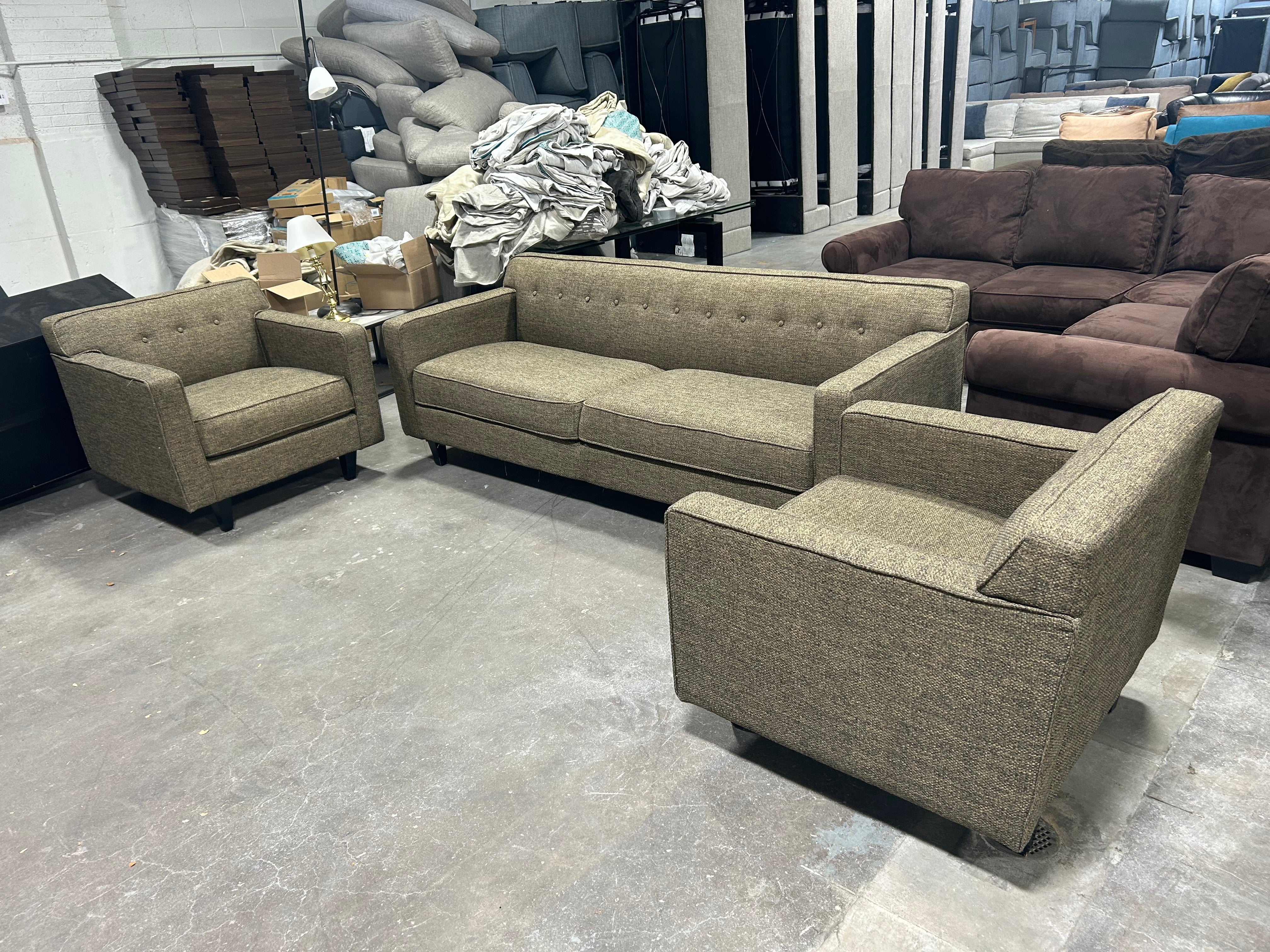 Looking to upgrade your living room with a modern touch? Look no further! This LIKE-NEW 3-Pc Contemporary Taupe Sofa & Chair Set is the perfect addition to your home. The neutral taupe color will complement any decor, while the textured woven basket weave cloth adds a unique touch. The sofa measures 85”x35”x30” and the chairs measure 34”x35”x30”, providing ample seating space for family and friends.
