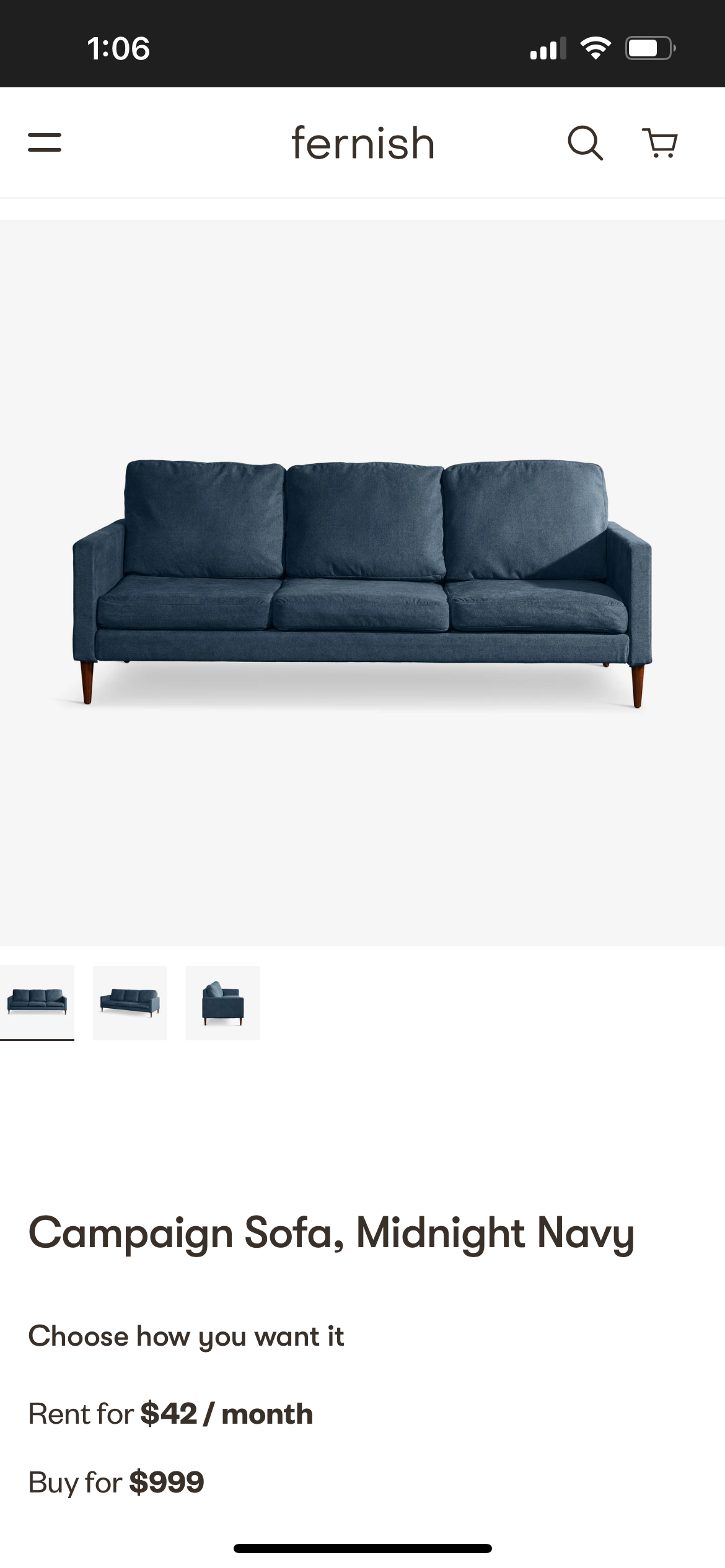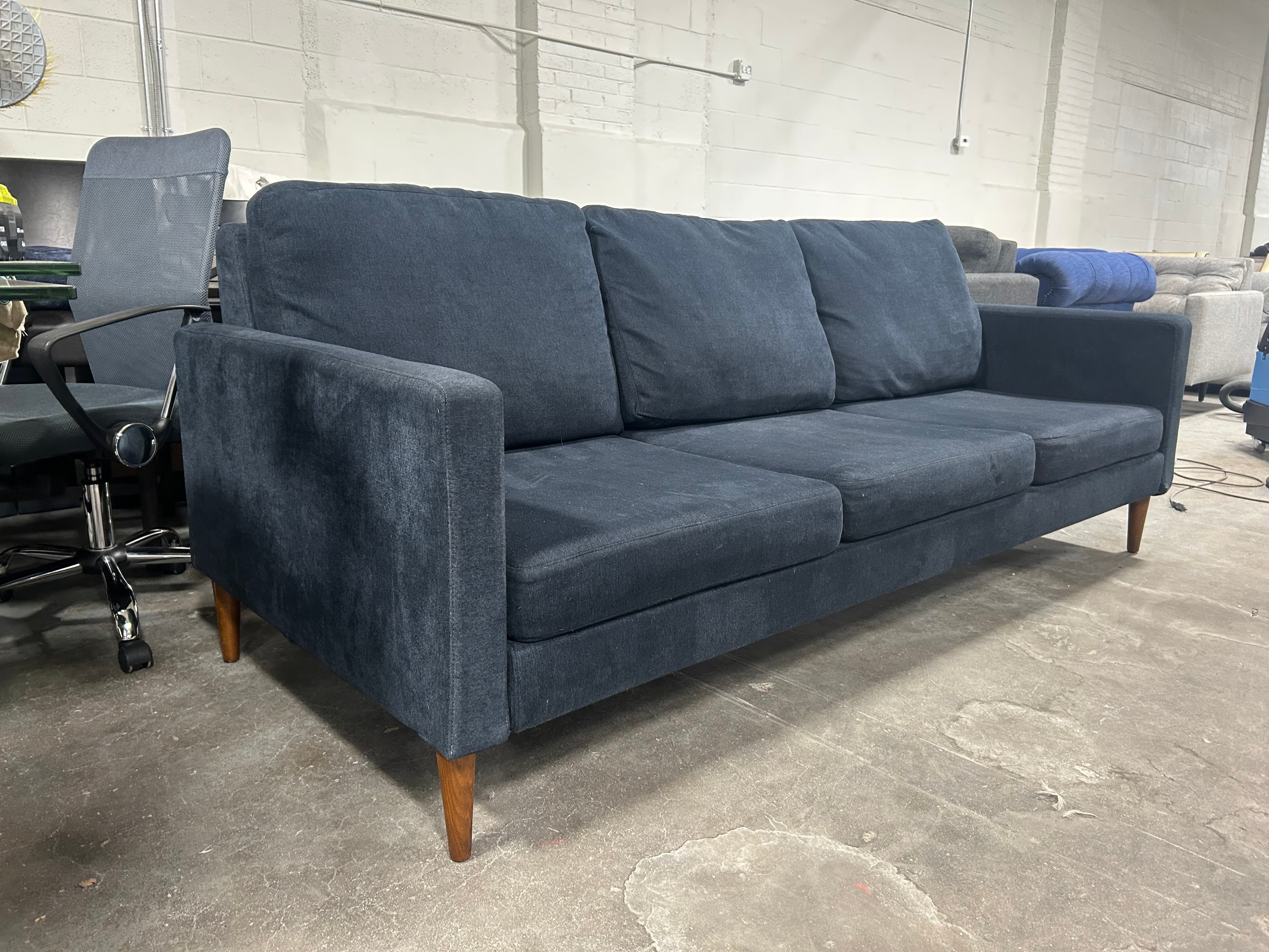 Introducing our Campaign Midnight Blue MCM Sofa! This stunning piece will add a touch of mid-century modern style to any space. The dark blue color is a classic and versatile choice that will complement a variety of decor styles. With dimensions of 90”x37”x32”, this sofa is the perfect size for lounging or entertaining. The clean lines and tapered legs give it a sleek and sophisticated look.