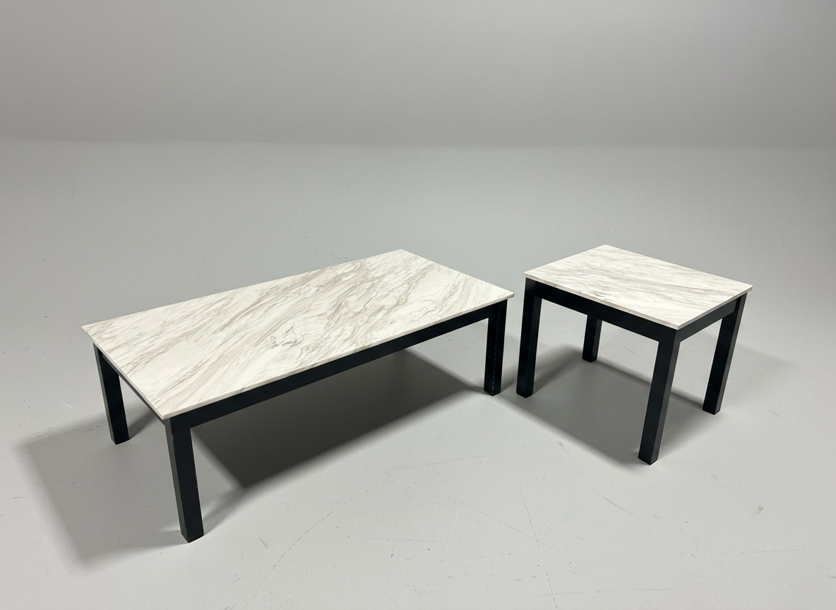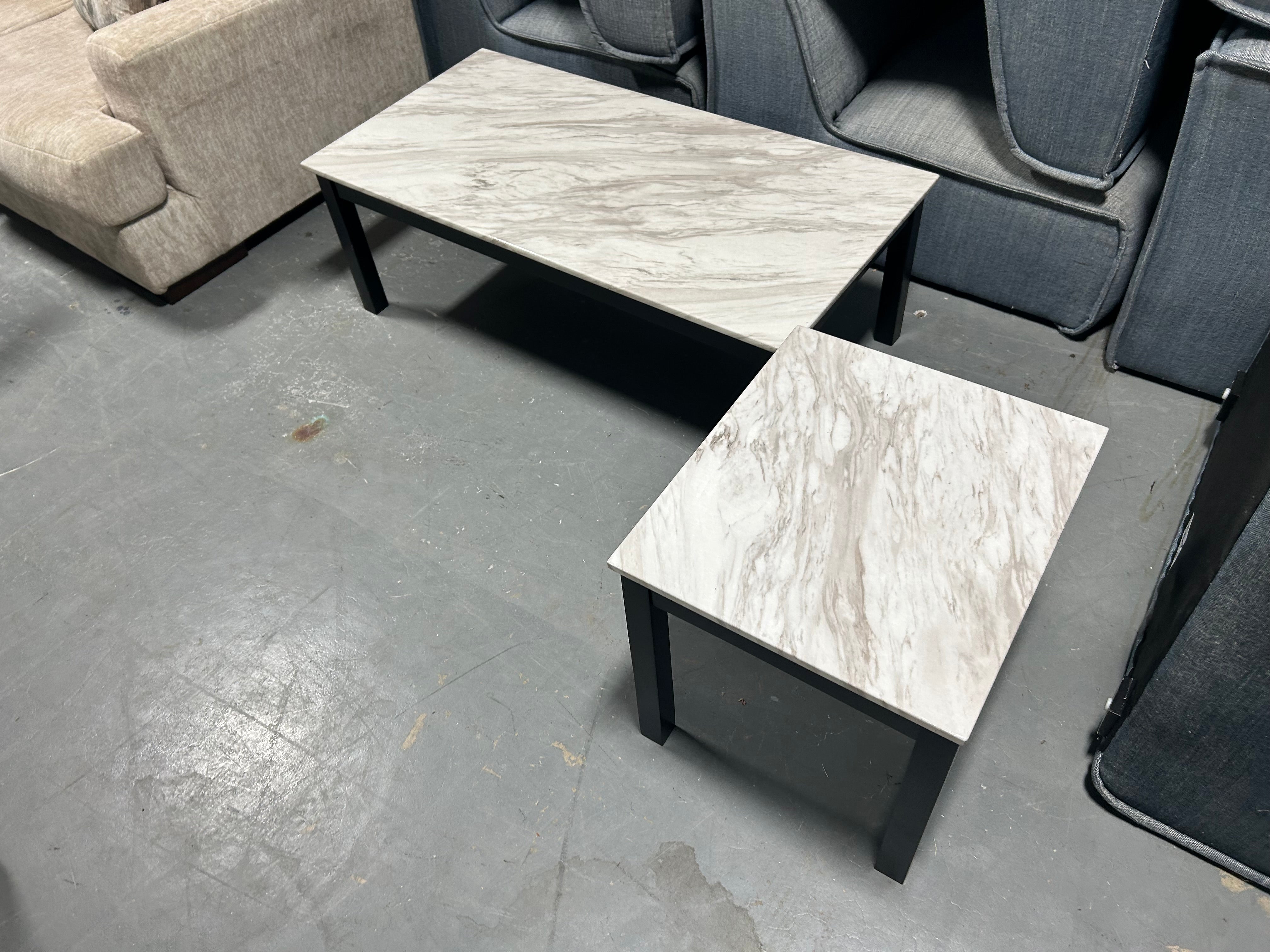 Introducing our sleek and modern Contemporary Marbled Coffee Table/End Table Set! This stunning set features a striking black and white marble design that will elevate any living room or den. The coffee table measures 47”x24”x16” and the end table measures 21”x18.5”x19”, making them the perfect size for any space. The unique marbled pattern adds a touch of elegance and sophistication to these functional pieces. Don't miss out on this one of a kind set!