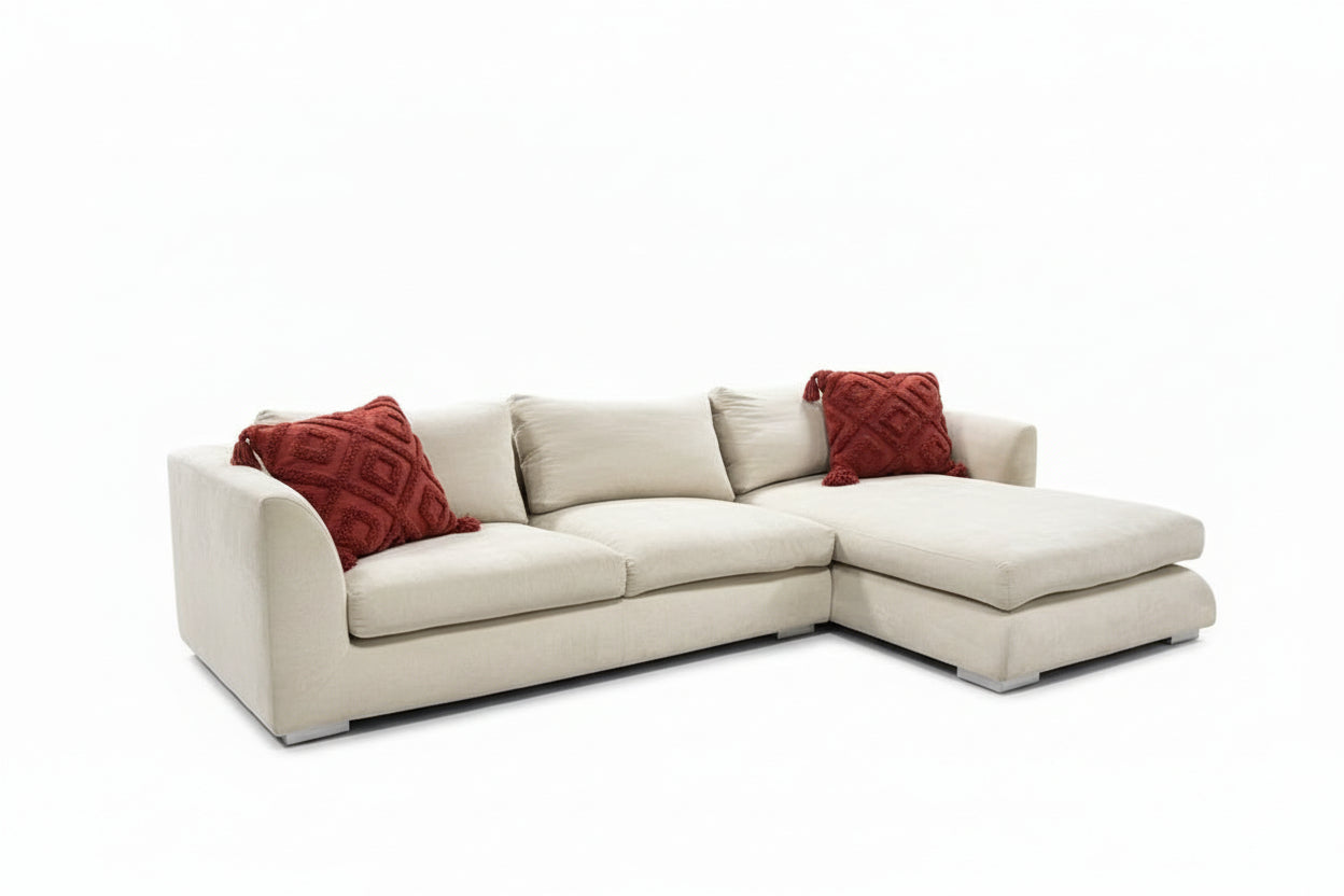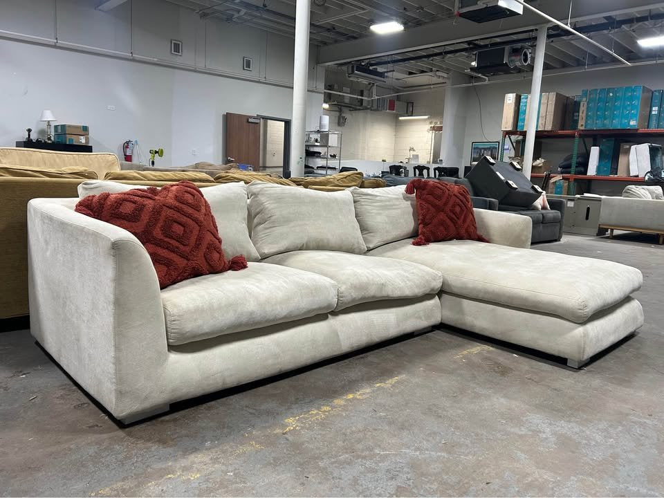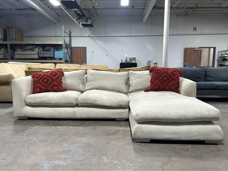 Indulge in cloud-like comfort with this off-white Mario Capasa Feathers Collection sectional measuring 110''x40''x26'' with a 67'' chaise. Renowned for its ultra-plush cushions and relaxed, low-profile design, this sectional brings a luxurious lounge experience to your living space. Wrapped in soft, off-white fabric with a modern silhouette, it’s both inviting and effortlessly stylish—perfect for those who crave comfort without compromising on contemporary elegance. Retails for $2,750 through Mario Capasa.