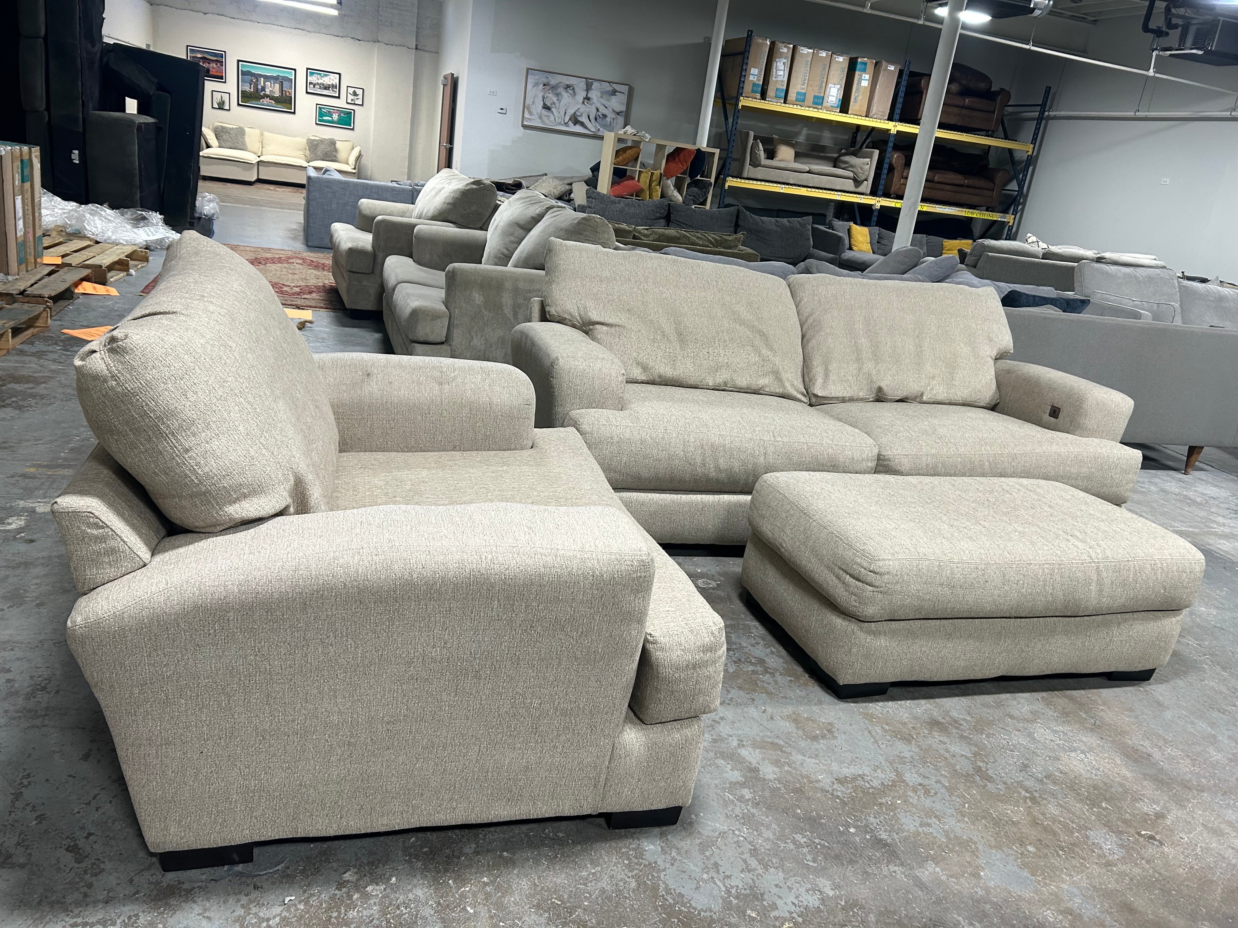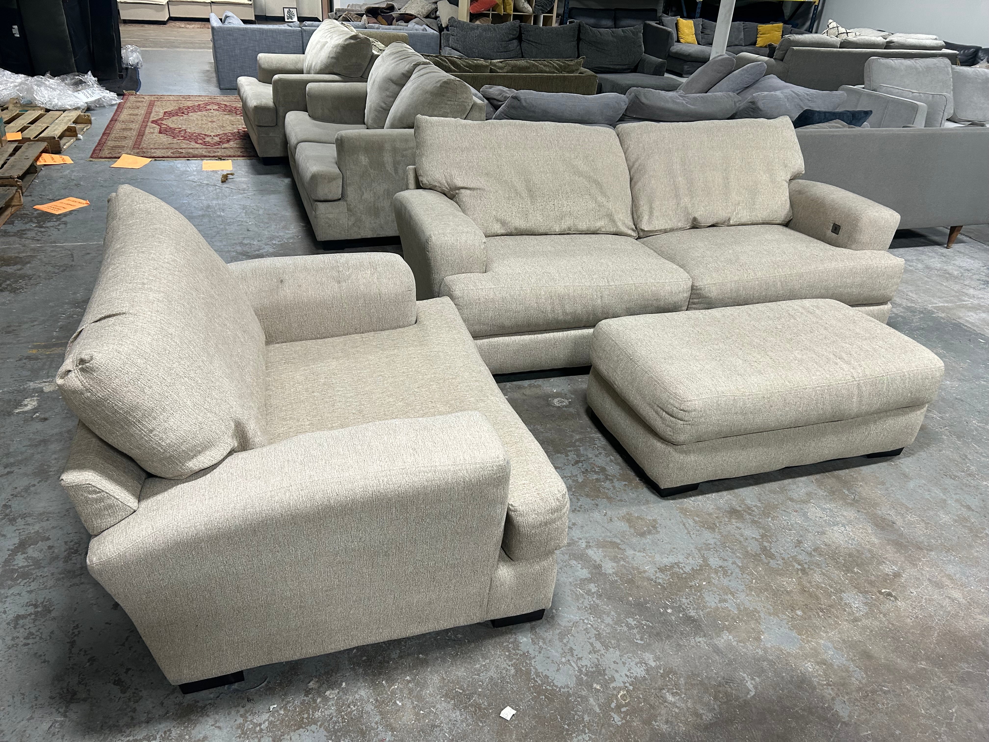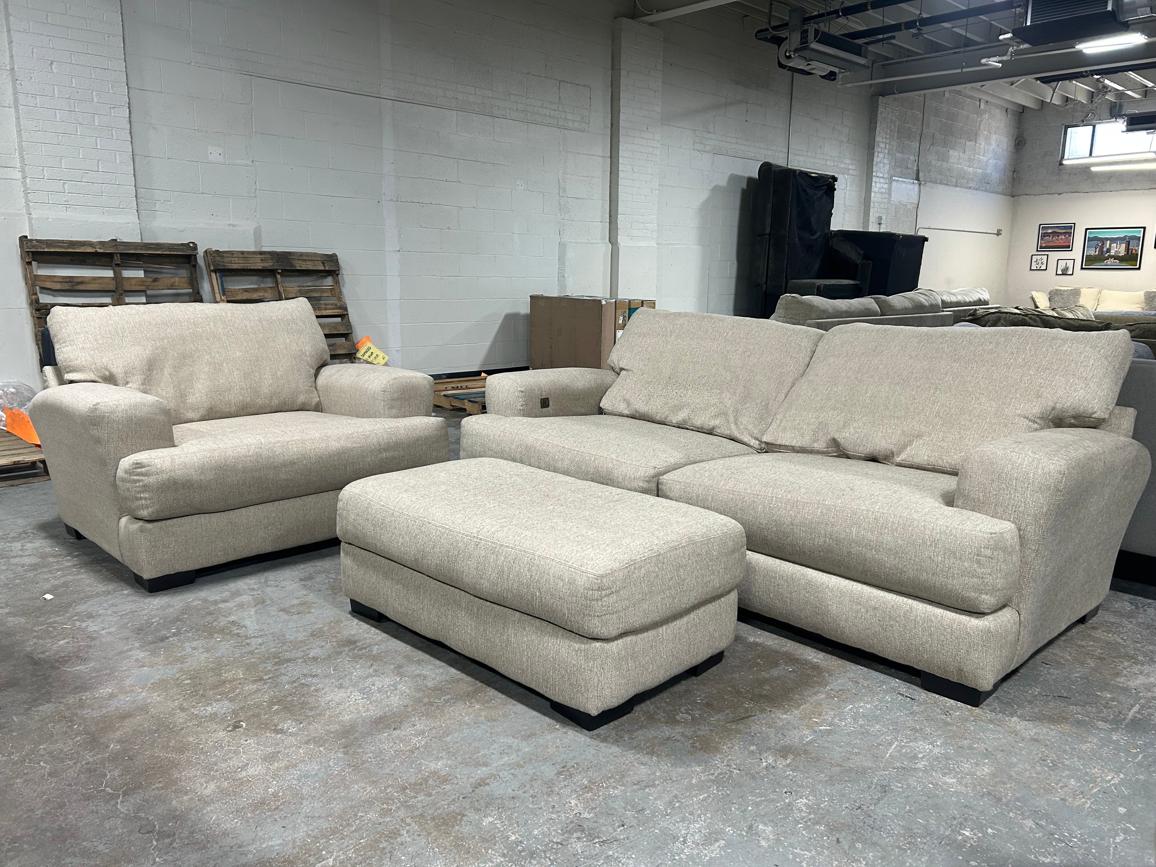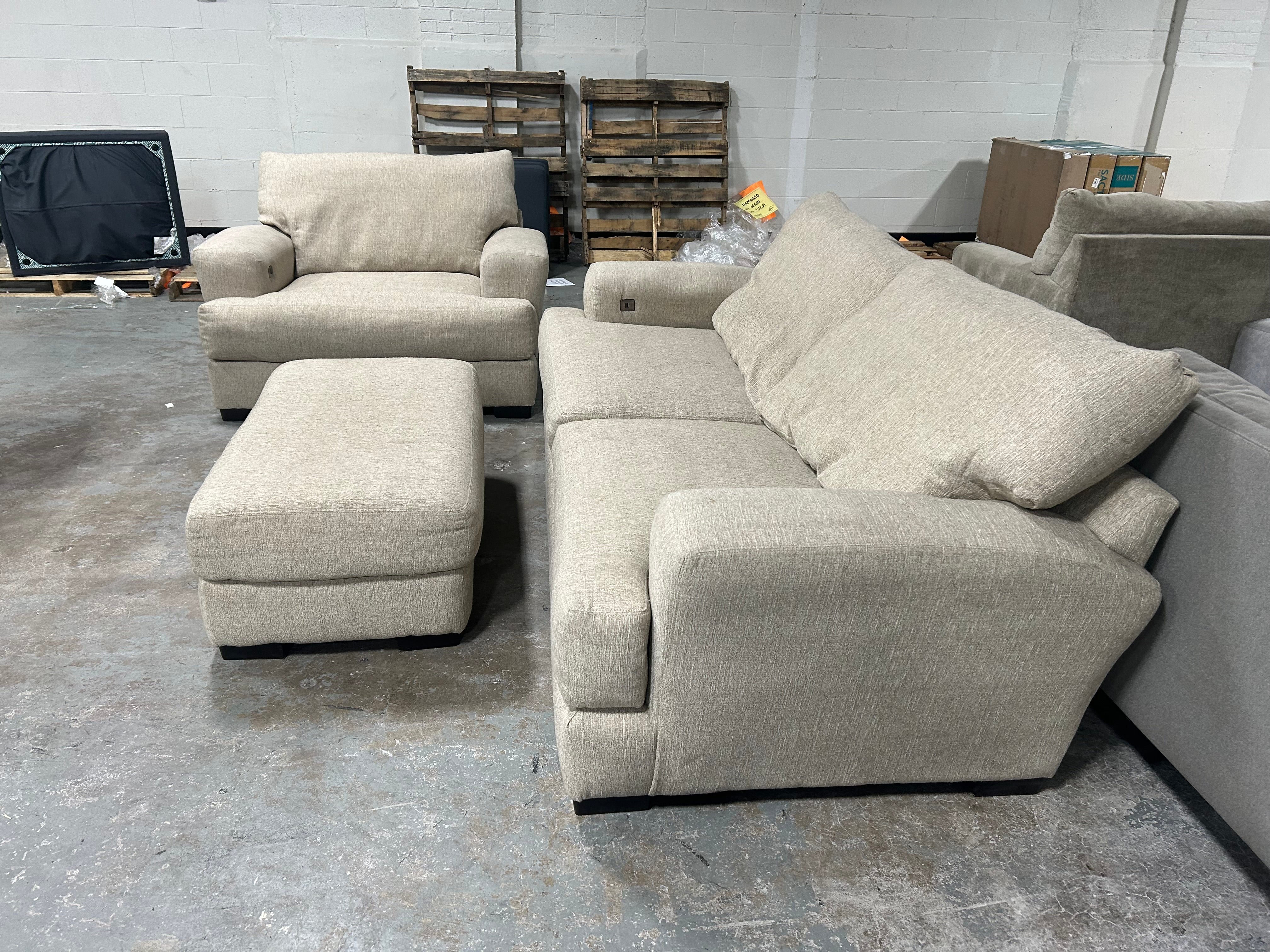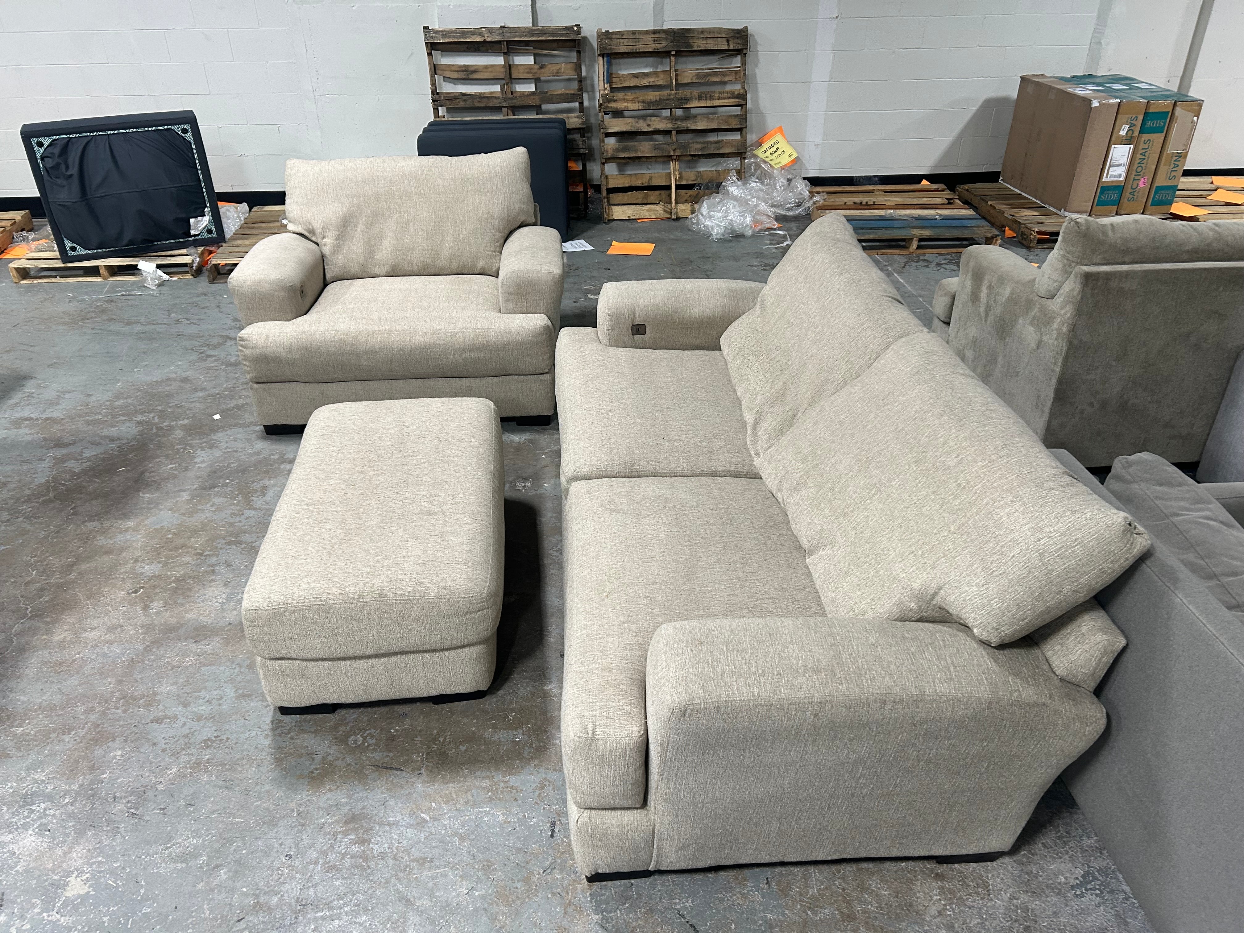 Looking for a comfortable and stylish furniture set for your living room? Look no further! This 3-piece beige sofa and chair set with ottoman is the perfect addition to any home. The neutral beige color will easily complement any decor. The sofa measures 90”x42”x25” and the chair measures 53”x42”x25”, providing ample seating for you and your guests. The ottoman, measuring 44”x25”x16”, not only adds extra seating but also has built-in USB ports for convenient charging. NOTE: the power cords are not included.