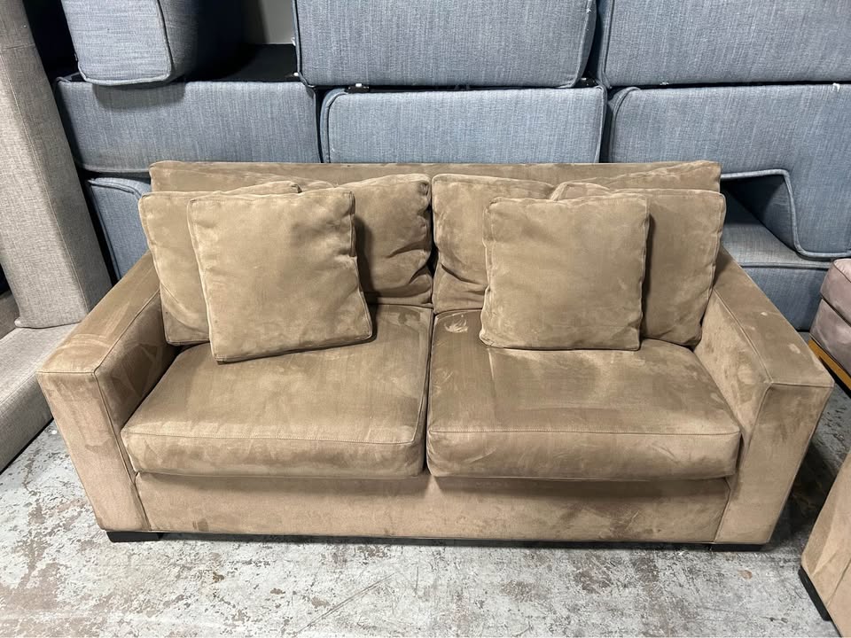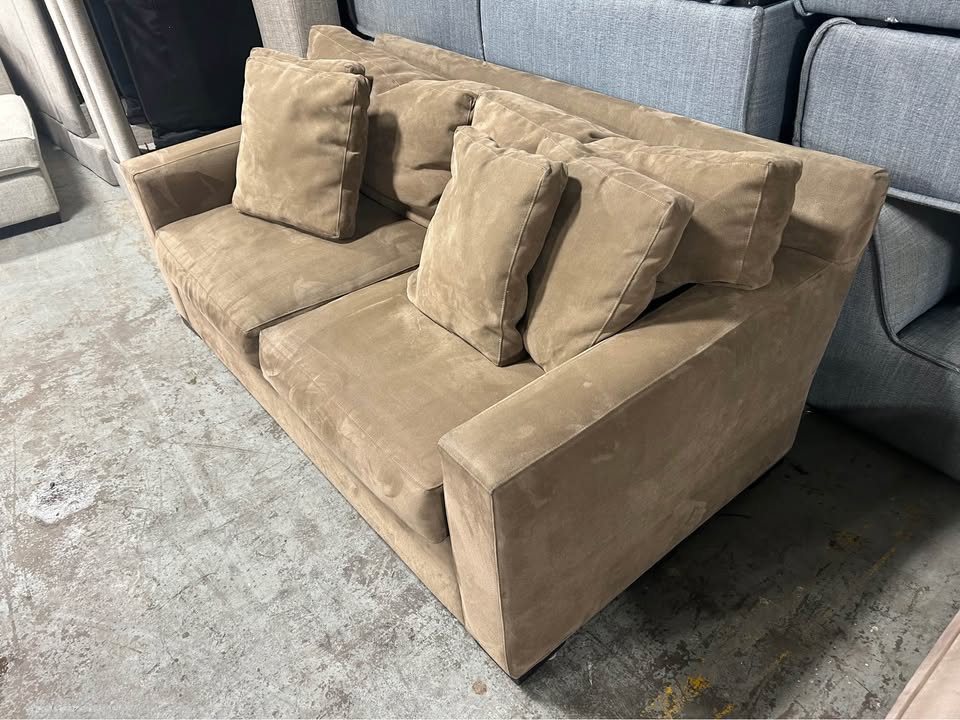 Classic Crate & Barrel Axis sofa in a versatile taupe fabric, measuring 76" wide x 45" deep x 32" high. This compact version of the Axis line features the same deep, comfortable cushions, clean modern silhouette, and durable construction the collection is known for. The neutral taupe upholstery pairs easily with any décor, while the wide arms and supportive seating make it perfect for apartments, living rooms, or smaller spaces. A high-quality, long-lasting piece from one of Crate & Barrel’s most popular sofa lines. Retails for $1,999.