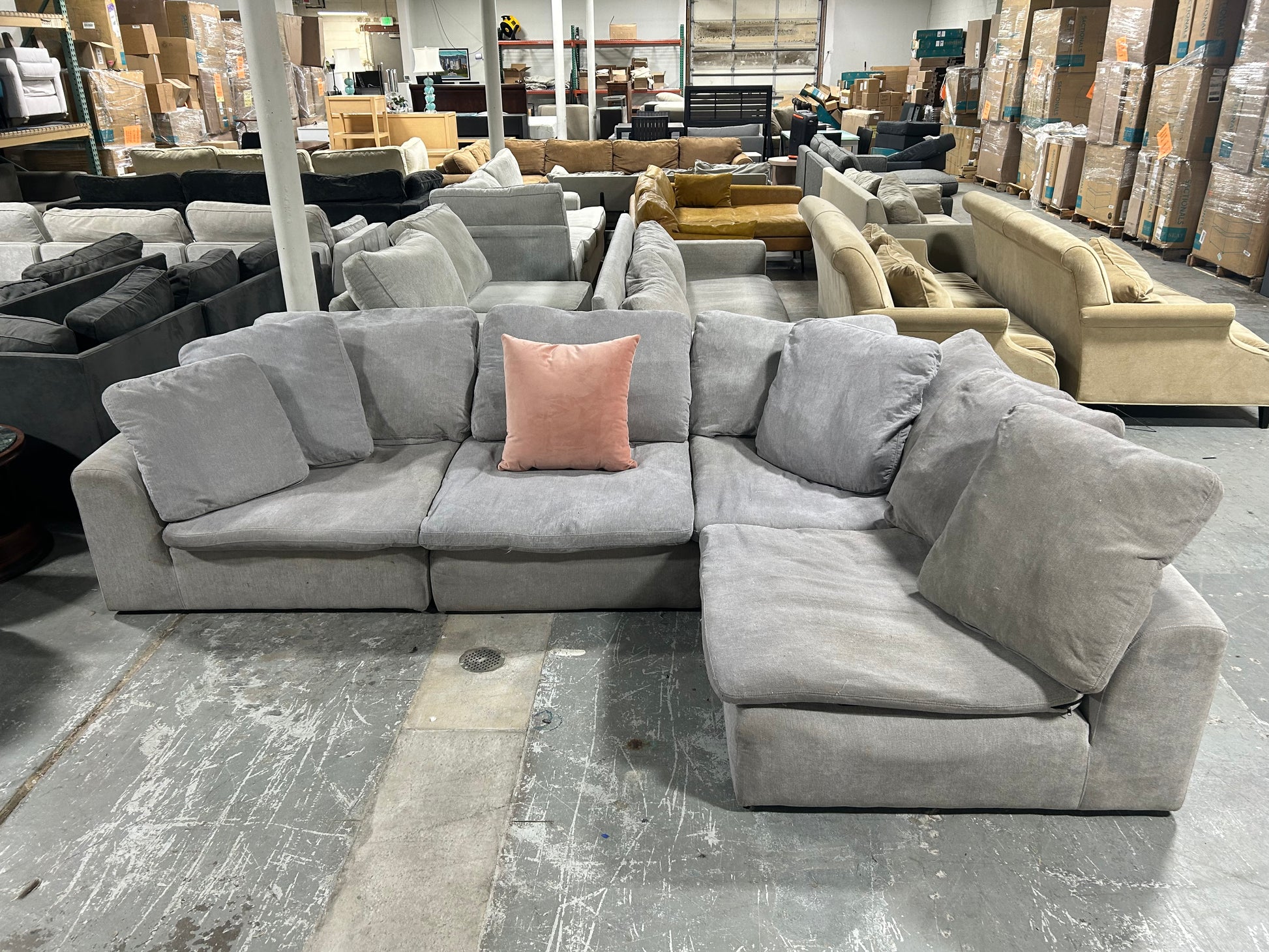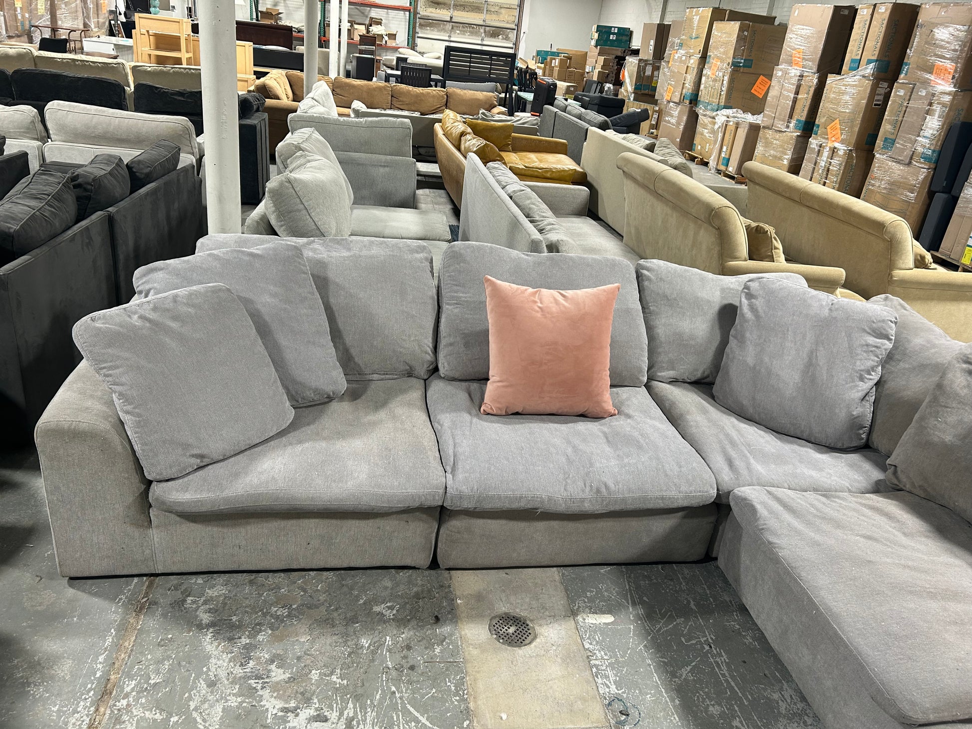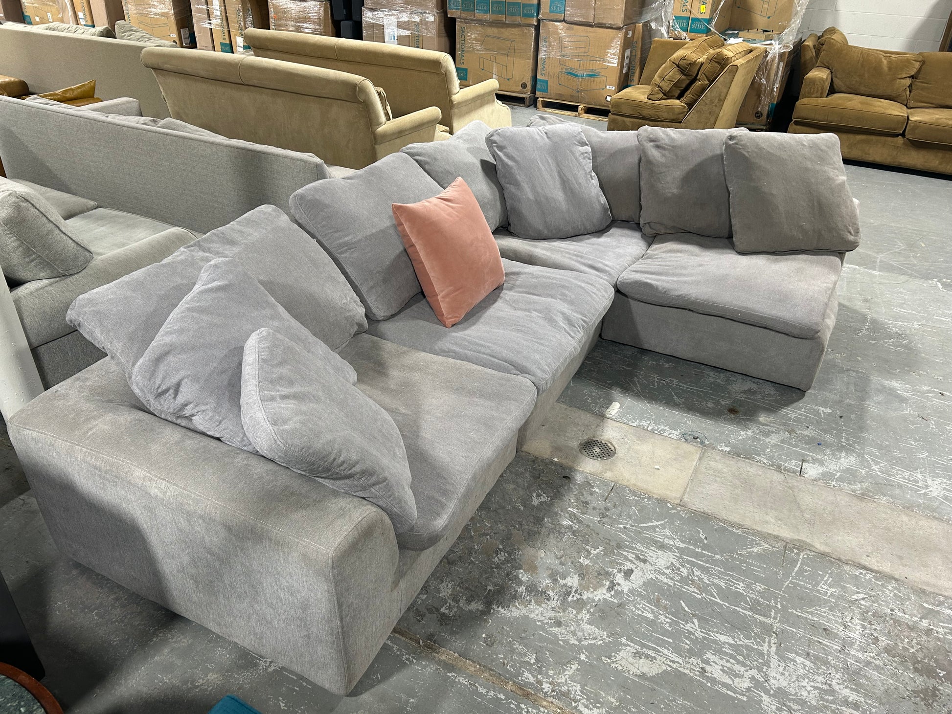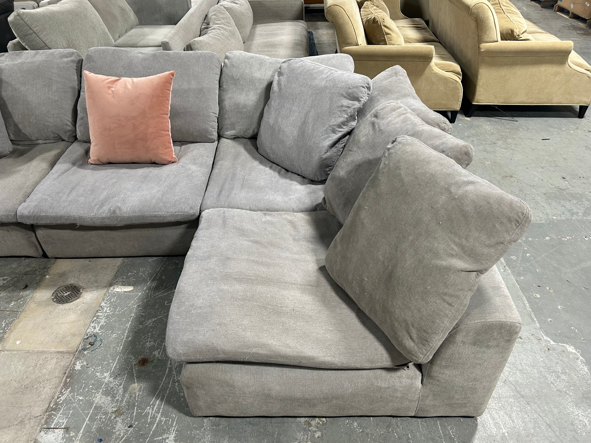 Looking for a cozy and stylish addition to your living room? Look no further! We have an EXCELLENT condition 4-piece modular light grey cloud sectional that will elevate your space. With dimensions of 126”x82”x45”x24”, this sectional is perfect for lounging and entertaining. And the best part? It's filled with soft, plush down for maximum comfort. Not only will this sectional add a touch of elegance to your home, but it's also versatile and can be rearranged to fit any space.