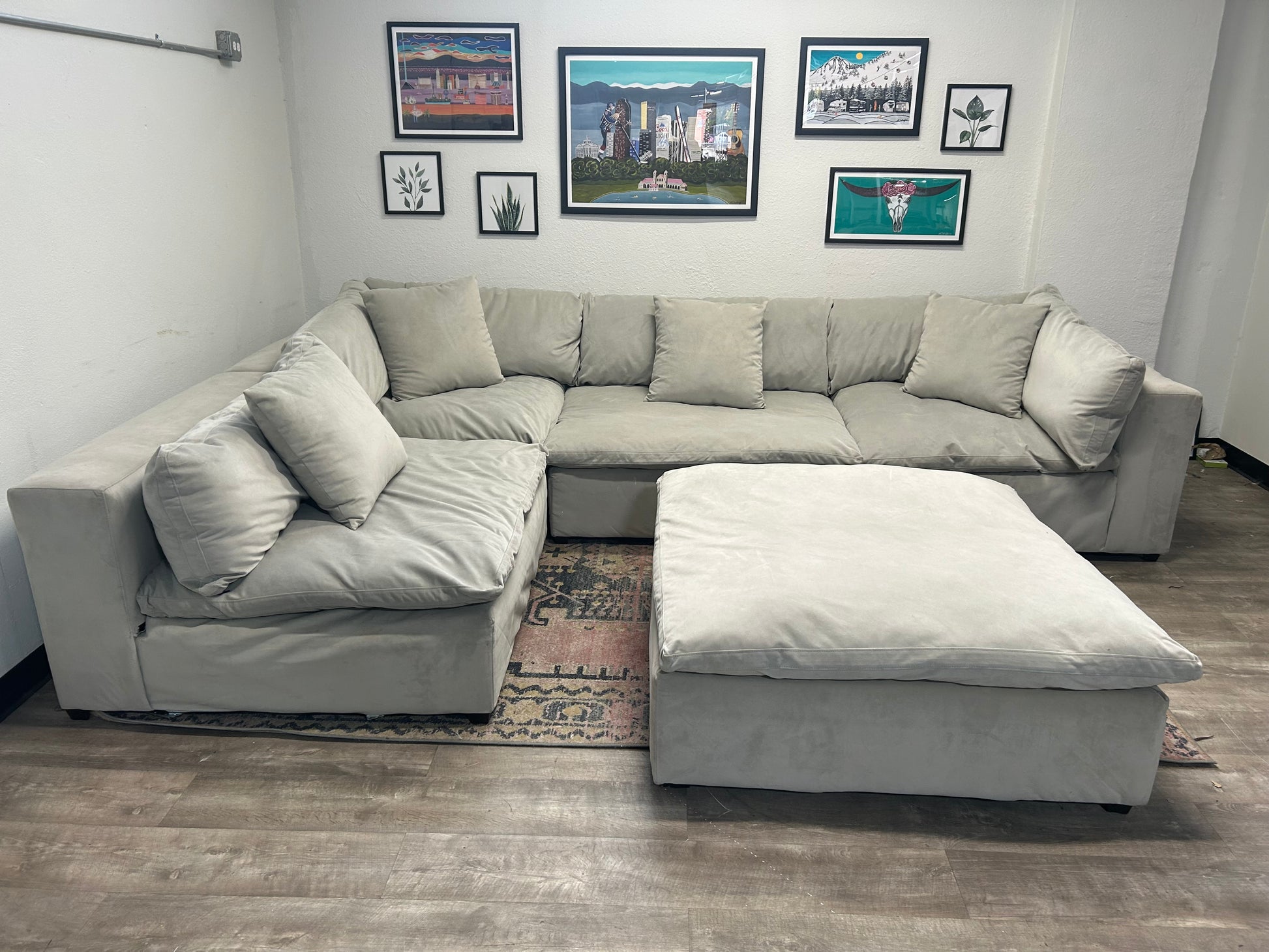 Transform your living space into a cloud of comfort with our EXCELLENT condition 5-Pc Modular Sky Grey Velvet Cloud Sectional. This versatile piece can be rearranged into a pit sectional to fit any layout. The beautiful sky grey color adds a touch of elegance to any room. Measuring at 90”x140”x45”x27” (as configured), this sectional is the perfect size for entertaining guests or lounging on your own. Made with performance velvet cloth, this sectional is not only stylish but also durable. The included ottoman adds extra relaxation options. From the trusted brand, Jackson Furniture, you can trust the quality of this piece.