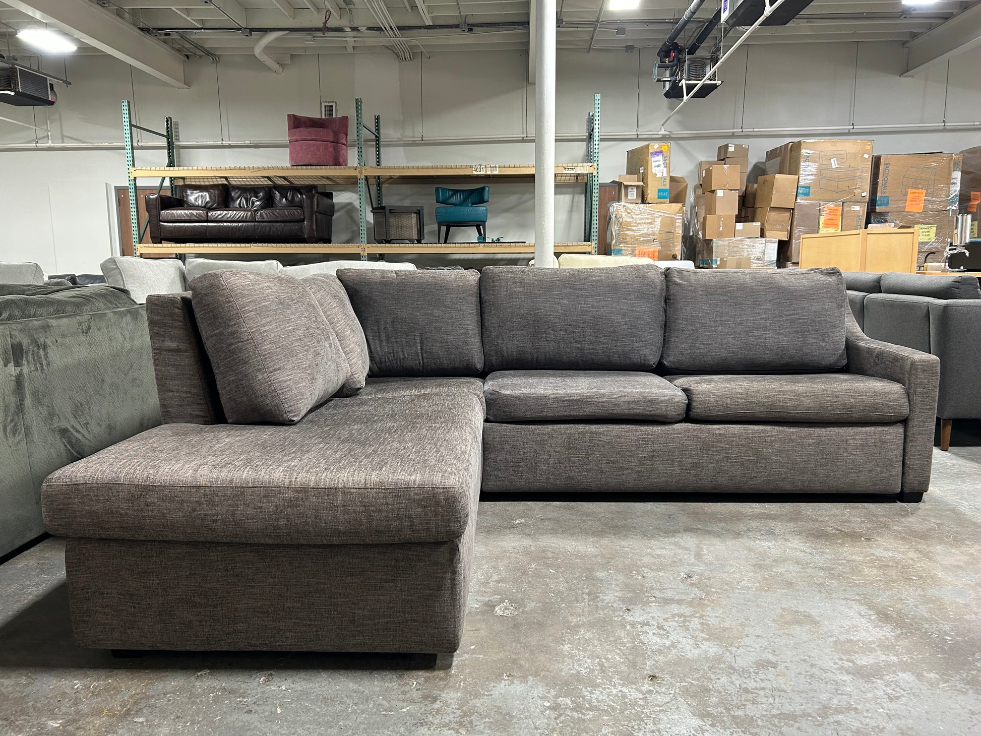 Introducing the American Leather Gray Bentley Sleeper Sectional - a stunning addition to any living space! This gorgeous piece is the perfect blend of style and comfort, featuring a sleek gray color that will complement any decor. Measuring 108”x90”x40”x34”, it offers ample seating for you and your loved ones. But what sets this sectional apart from the rest? It's made by American Leather, a trusted name in the furniture industry known for their high-quality craftsmanship. Plus, with its chaise design and pullout sleeper bed, you can kick up your feet and relax in ultimate comfort. NOTE: there is some minor sun-fading on the cushions (as pictured). Retails for $7,699.99 through Jennifer Furniture.