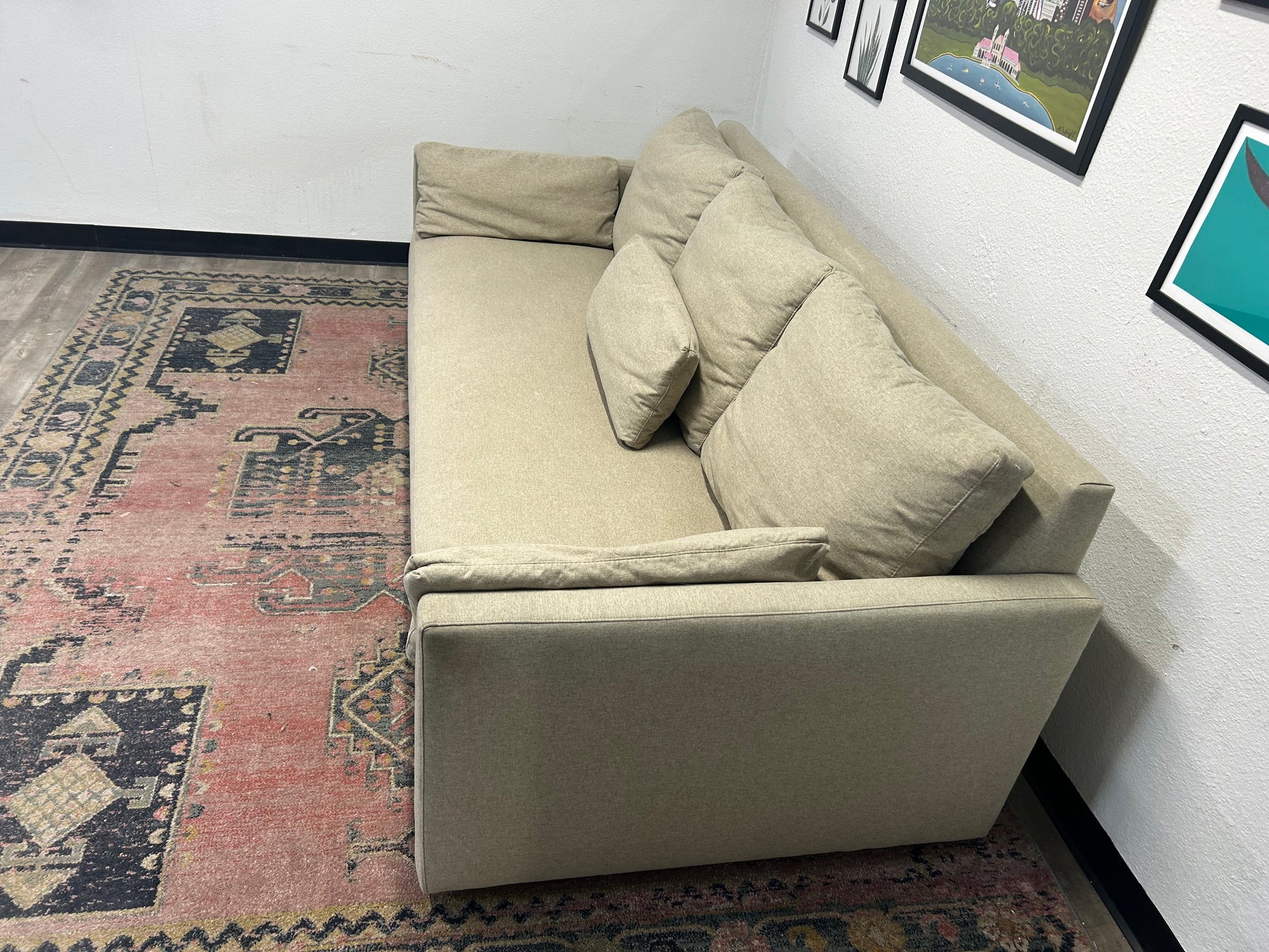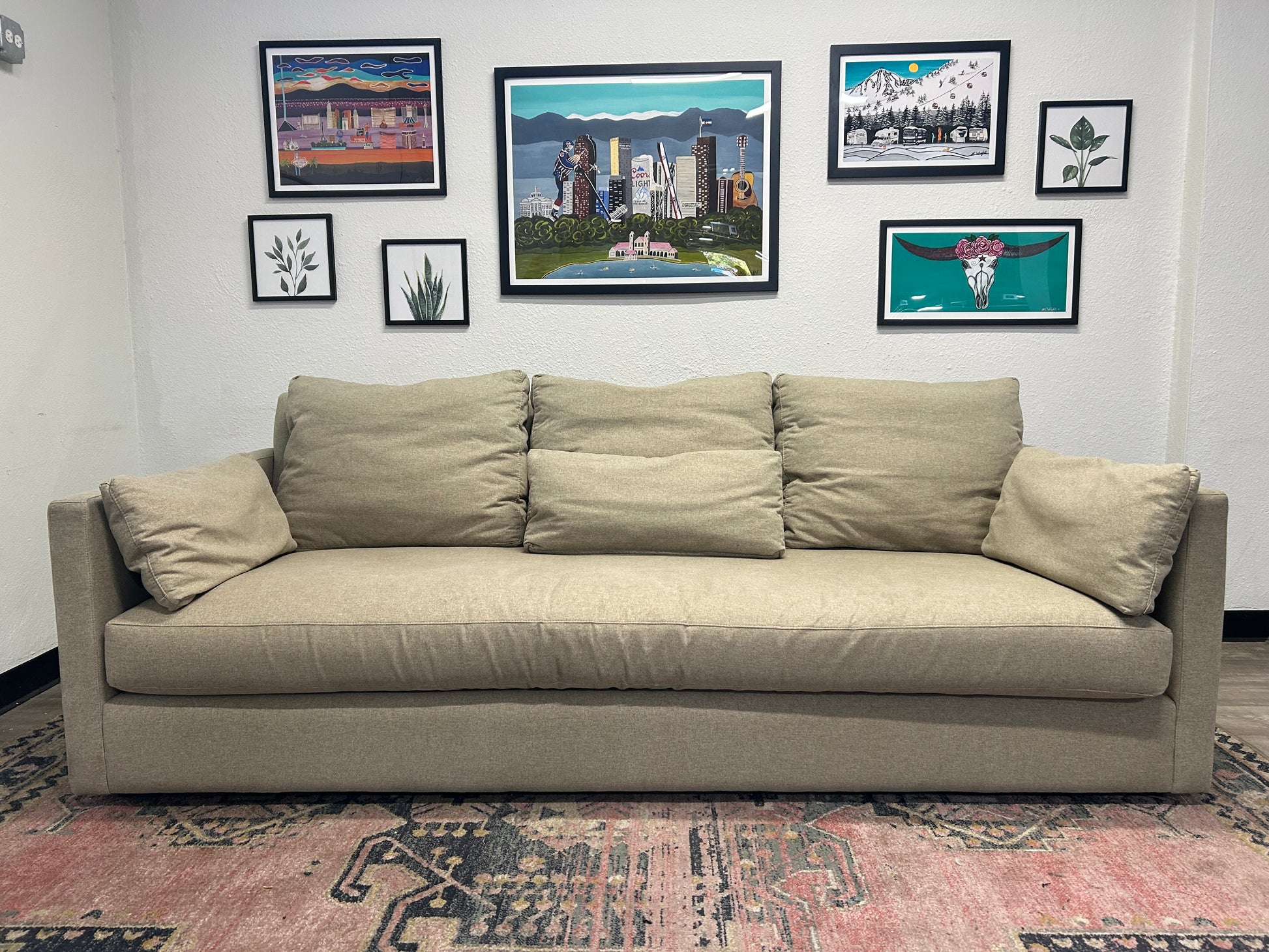 Looking for the perfect addition to your living room? Look no further than this stunning LIKE-NEW Arhaus Beige Kipton Bench-Seat Sofa! The beautiful beige (soft sand) color adds a touch of elegance to any room, while the spacious 94”x44”x32.5” dimensions make it the perfect spot for family movie nights or weekend lounging. Plus, with its comfortable bench-seat design, no longer sold by Arhaus, you can easily fit multiple people on this sofa without feeling crowded. But that's not all - this sofa is from the renowned brand Arhaus, in the Camden Collection, known for their high-quality and stylish furniture. And at Instant Offer Furniture, you can get this sofa at a fraction of the $5,400 retail price! Don't miss out on this amazing deal.