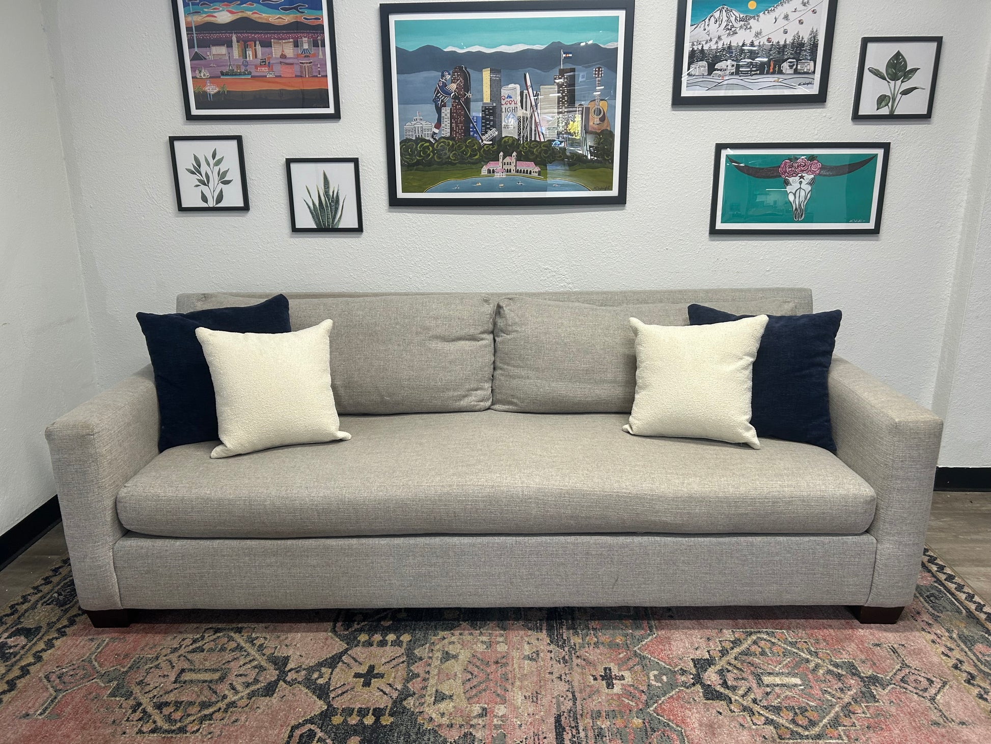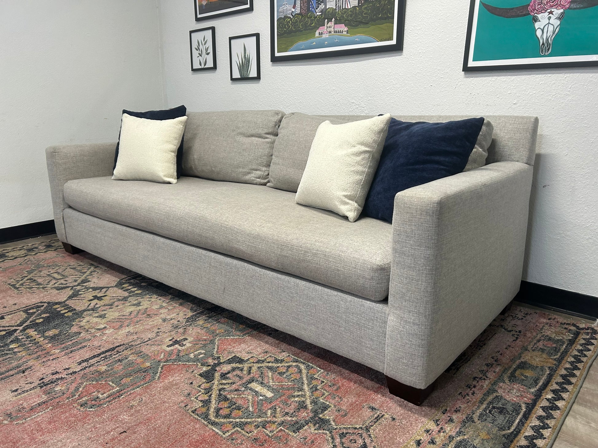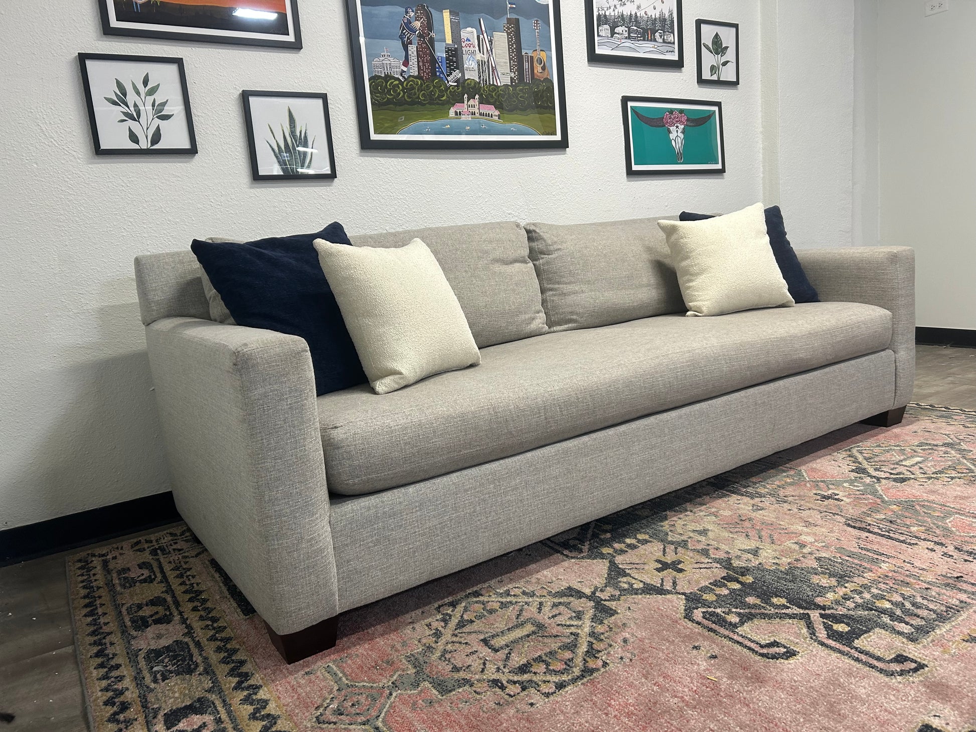 Looking for a beautiful, comfortable, and high-quality sofa? Look no further! This LIKE-NEW Pottery Barn Light Gray York Square Arm Bench-Seat Sofa is the perfect addition to your home. The light gray color will complement any decor and the dimensions of 94.5”x38x33” make it the perfect size for any living room. The down-filled cushions provide ultimate comfort while the textured woven cloth adds a touch of sophistication. Retails for $3,499 through Pottery Barn. Don't miss out on the opportunity to own this stunning piece.