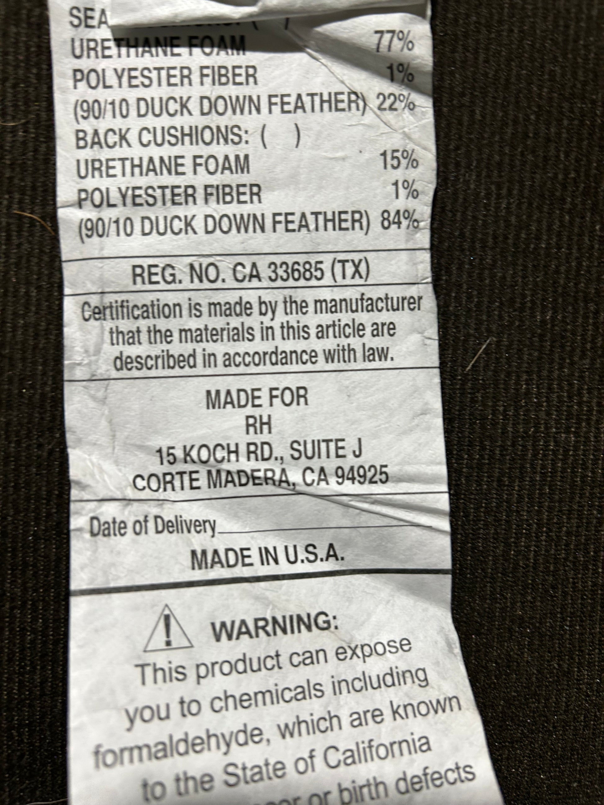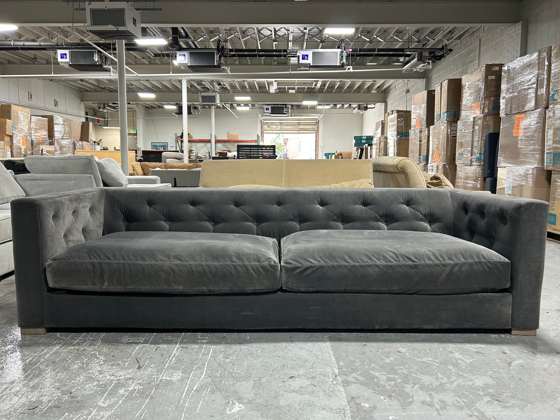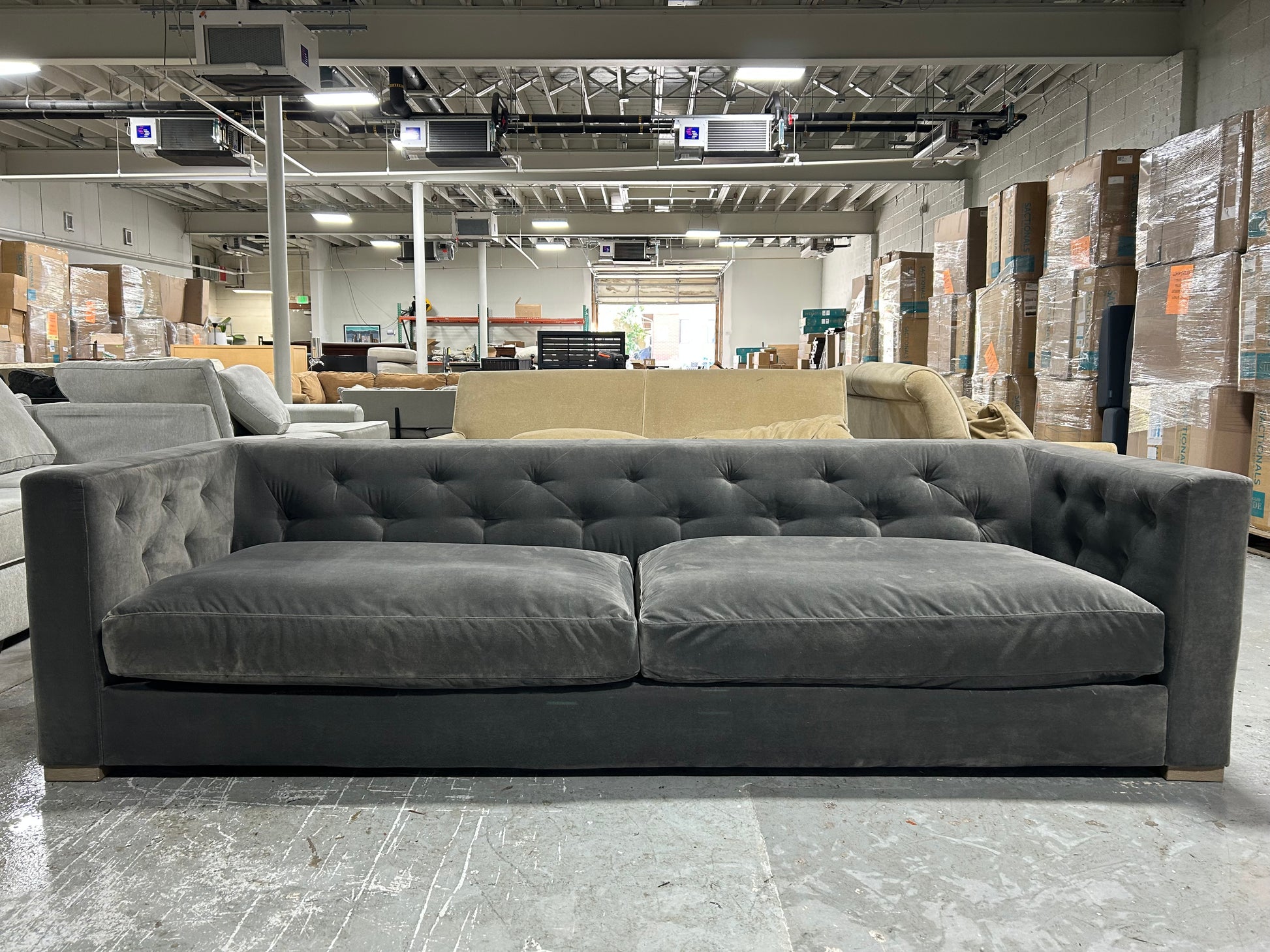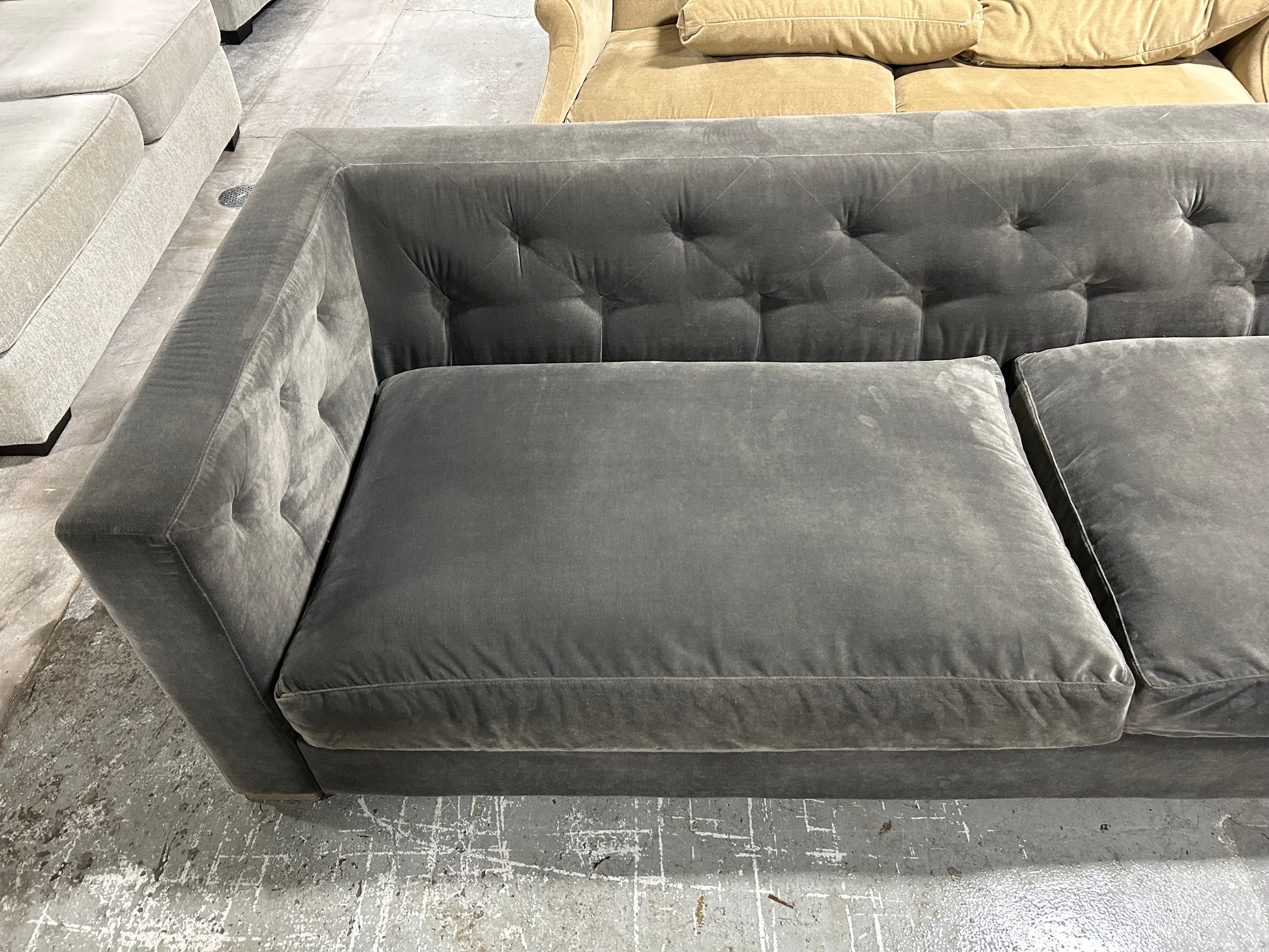 Looking for a stylish and comfortable sofa to complete your living room? Look no further! Our EXCELLENT condition Restoration Hardware Modena Tufted Shelter Arm Sofa in gray is the perfect choice. Crafted with Performance Velvet, this sofa not only looks amazing but also offers durability and easy maintenance. The Mid-Century Modern design adds a touch of sophistication to any space, while the Luxe depth provides ultimate comfort. Measuring 108”x41”x28”, this sofa is spacious enough to accommodate your family and friends. Don't miss the chance to make this beautiful piece a part of your home. Stop by our store, Instant Offer Furniture, located in North Denver off York St. & i70. Our curated, ever-changing inventory is available exclusively through our Facebook group, "Instant Offer Furniture LLC". Hurry and grab this Restoration Hardware Modena Tufted Shelter Arm Sofa before it's gone! *Prices exclude sales tax*