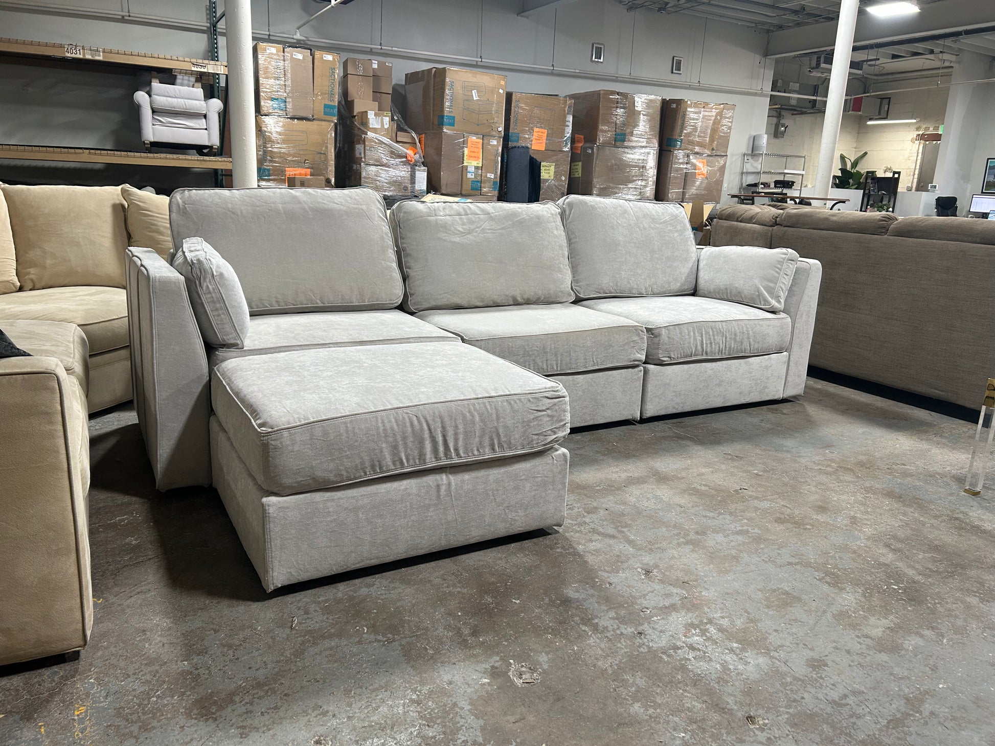 Looking for the perfect addition to your living room? Look no further! This 4 base, 5 side Sky Gray LoveSac sectional is the perfect blend of style and comfort. With its spacious dimensions of 117”x64”x38”x28.5”, it can easily accommodate your family and guests. The neutral beige color will complement any home decor. Whether you're watching a movie or lounging with a book, this Sactional will provide the ultimate relaxation. Don't miss out on this amazing deal! Notes: This item is in MINT condition (outlet quality) and was just unboxed in our shop. All wooden shoes, feet, and clamps included. Also available in charcoal and beige. Square arms available. Retails for $5,215 through LoveSac.
